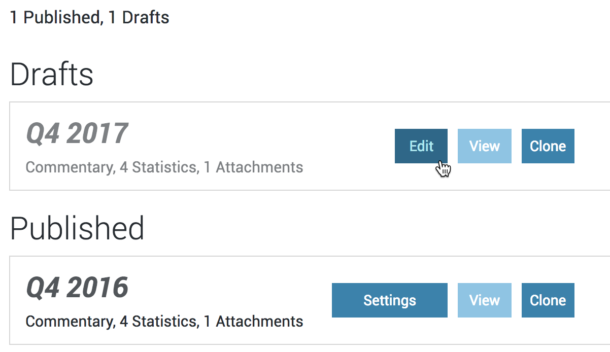 When you are ready, it i,s easy to publish a report. From the "Reporting" Dashboard, select the "Edit" button next to the report you are publishing.